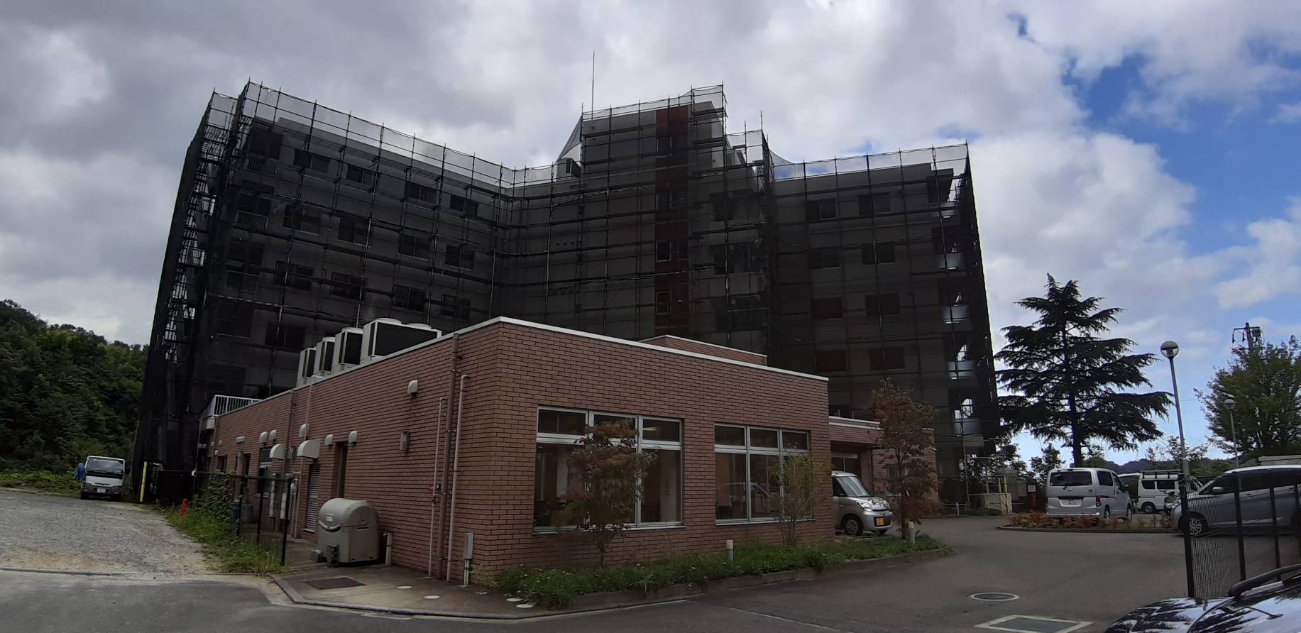 松山市道後の介護施設の足場が組みあがりました。