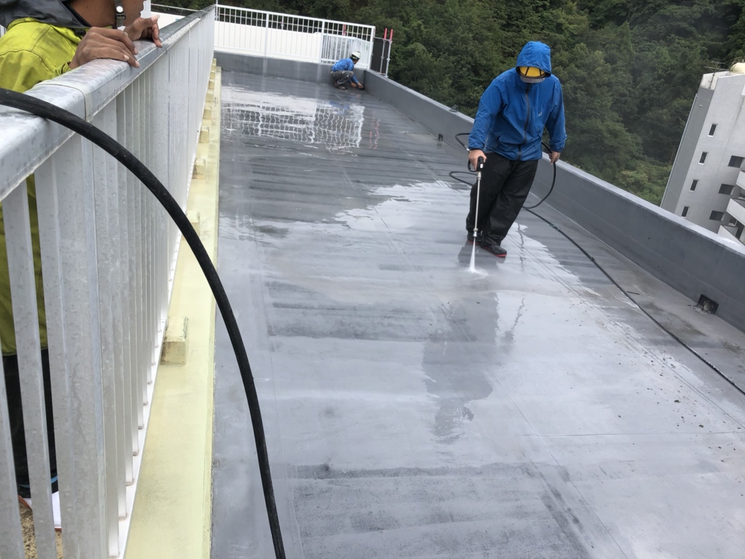 ヘルメットをかぶり、安全面を配慮しながら洗浄しております。