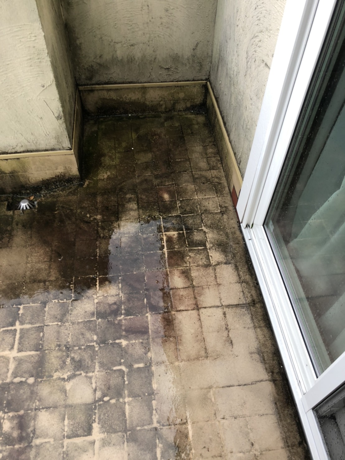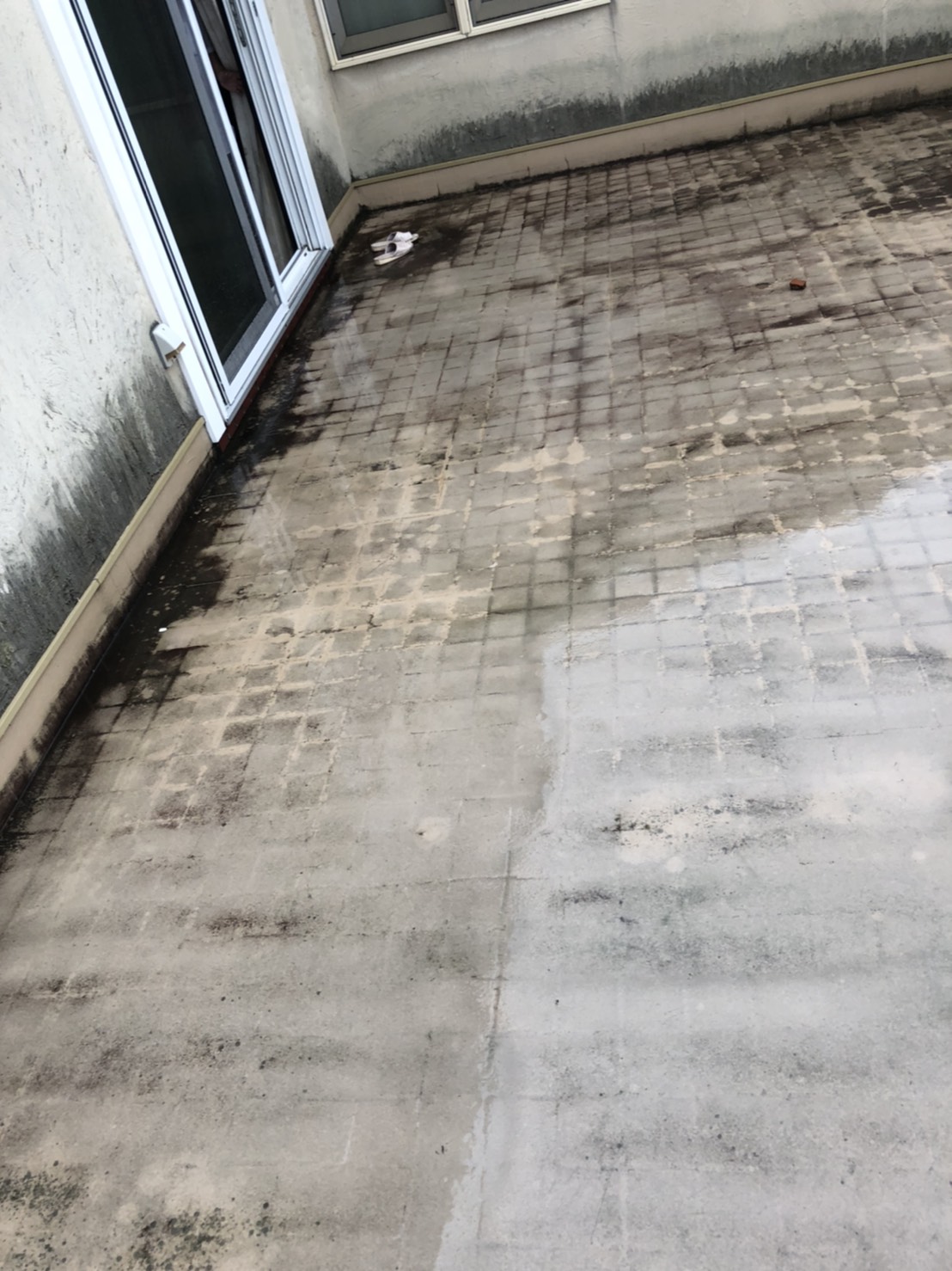 外壁に苔等が発生して、床も汚れがたくさん付着しています。