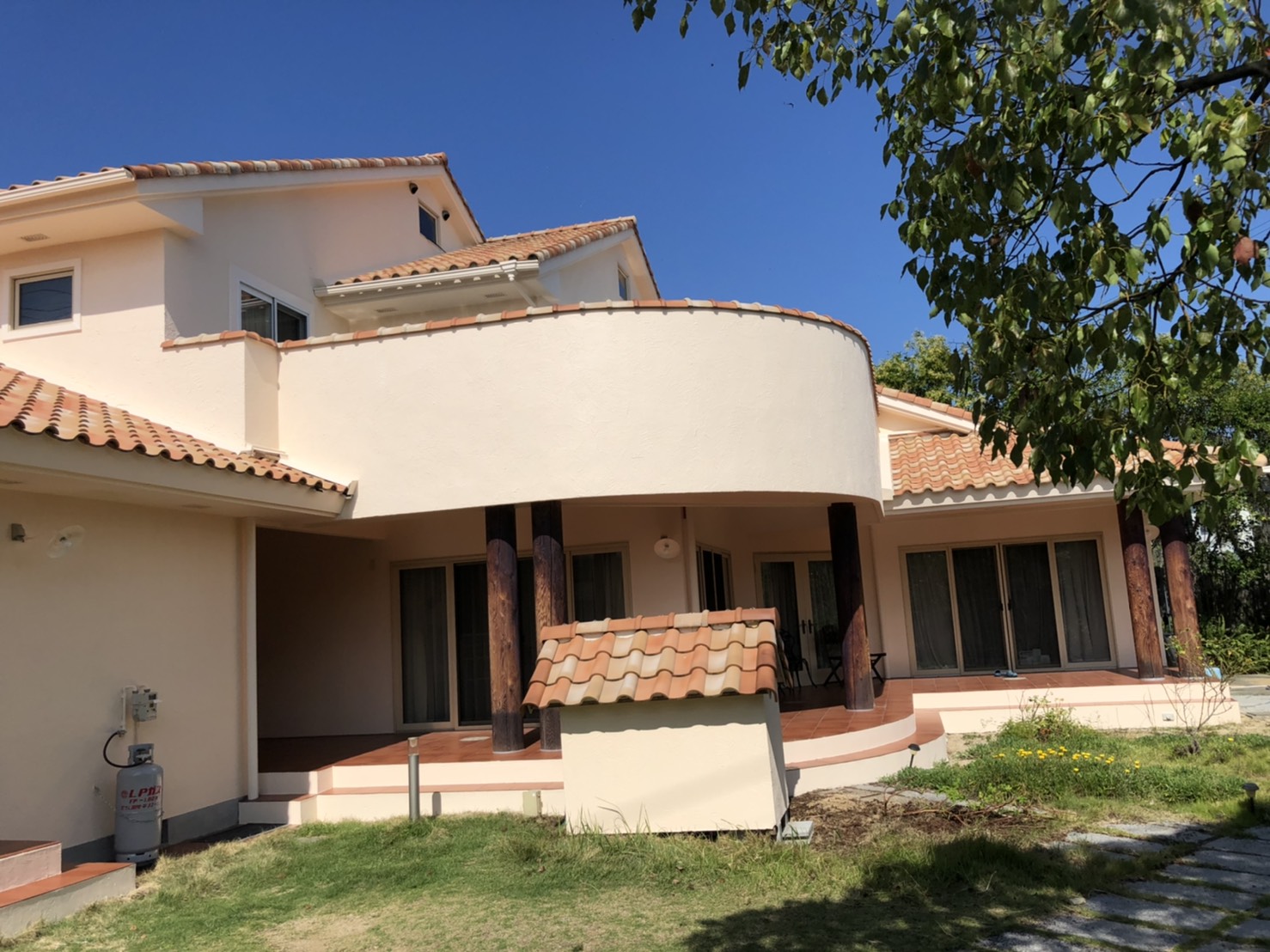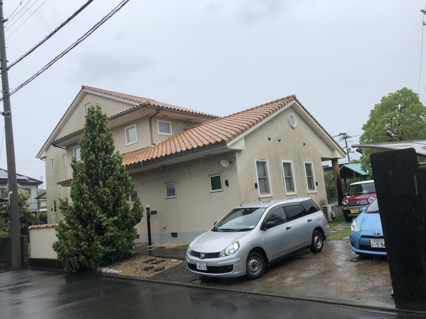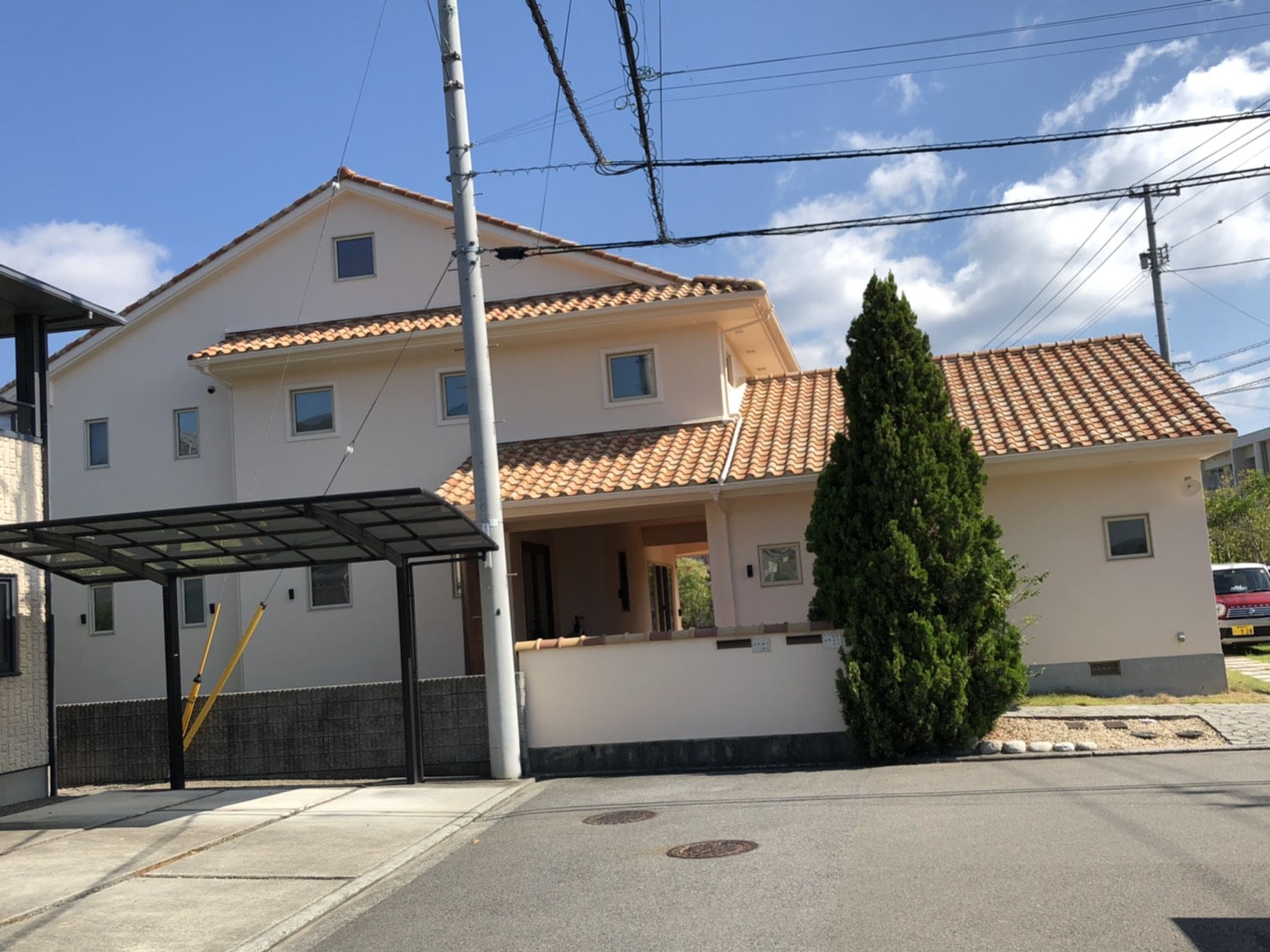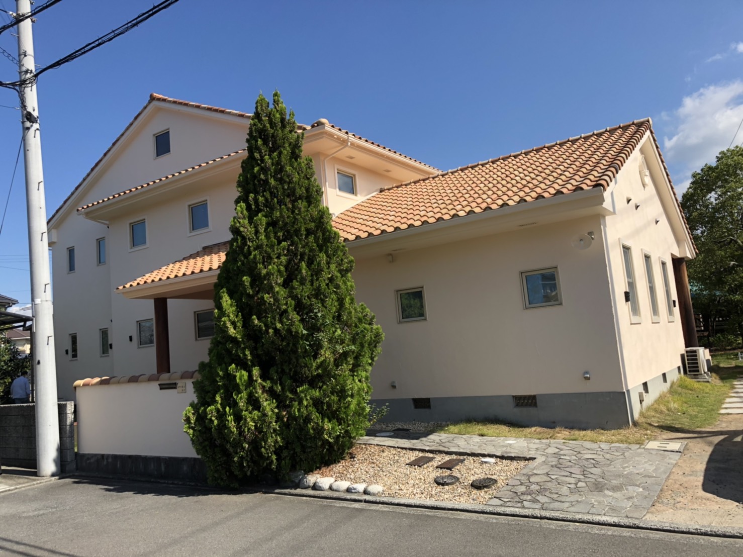 施工後の写真を撮影したときには、お天気も良くはれて、青空にクリーム色の外壁と屋根がとってもあいますね。